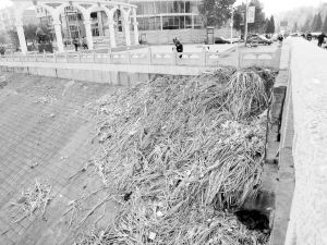 昨日,记者在市区中州大道桥上看到,堤坝上堆满了甘蔗皮,严重影响市容市貌。据了解,这些甘蔗皮都是前段时间在此处卖甘蔗的商贩倾倒的。