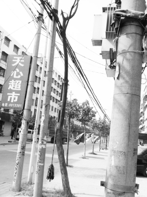 昨日,记者在市区建新西路看到,路边的一棵枯树依靠在电线杆上,枯树枝干正好压在电线杆的电线上,存在安全隐患。