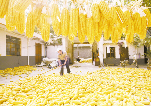这是山东省临沂市郯城县郯城街道西赵村农民在晾晒玉米(2012年10月8日摄)。