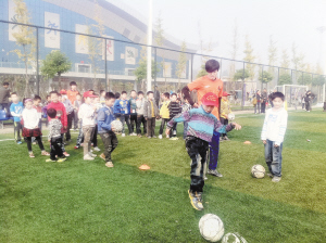 9时30分许,小记者们在带队老师的带领下,分别来到丰厚足球场和雪狼网球场观摩足球、网球技术展示,并参与互动体验及游戏。