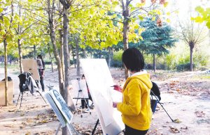 秋日、落叶、阳光,组成一幅美丽的画面。10月31日下午,一群正为高考“厉兵秣马”的学子在滨河公园写生,聚精会神地绘制属于自己的美丽梦想。晚报记者 张志新 摄