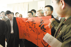 当天上午,河南日报社新闻摄影部主任、郸城籍书法名家侯和平挥毫写下了“喜迎党的十八大”的书法作品后,10余名书法名家现场挥毫泼墨,满怀激情地写下对党的十八大胜利召开的美好祝福。
