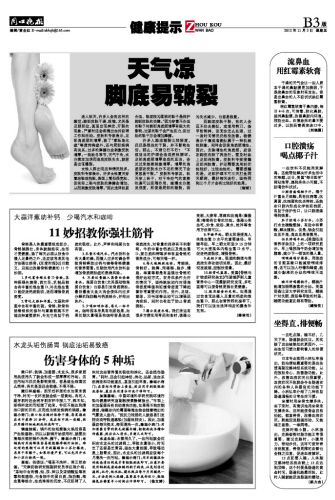 进入秋天,许多人会有这样的感觉:脚部皮肤干燥、粗糙,尤其是足跟部位,甚至出现掉皮、开裂的现象。严重时还会疼痛出血并妨碍工作和活动。皮肤科专家表示,足部角质层的增厚,除了“掌跖角化症”等遗传病症外,还与局部疾病有关系。过多的摩擦也会刺激皮肤增厚。一到秋冬季节,天气干冷,水分蒸发加速而造成皮肤失水,就容易出现爆裂。