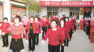 11月2日上午,川汇区七一路办事处文明社区办公地点的院内锣鼓喧天、歌声嘹亮。市妇联在此开展了喜迎十八大妇女群众进社区活动。活动期间,该社区妇女群众现场表演了歌曲、盘鼓、“和谐舞”等精心准备的节目,表达了对祖国的热爱之情。精彩的演出博得了在场观众的热烈掌声。