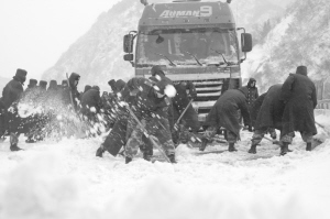 北京突降的大雪导致京藏高速八达岭路段最厚积雪达80厘米,在居庸关向北10公里处,1000多辆车辆受阻,数辆大货车因路面湿滑无法挪动而横在路中央。