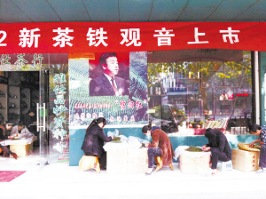 深秋时节新茶上市,大量铁观音茶从福建安溪进入我市。带梗、有杂枝的铁观音一斤才卖几十元,而把茶梗、杂质去掉,一斤铁观音茶便可卖到一二百元。于是,精明的茶商便大量购进带梗的铁观音茶,让店里的售货员边挑拣茶梗边卖茶,最大限度地利用劳动力价值。图为市区七一路茗仕茶行门前几位“拣茶工”在挑茶。
