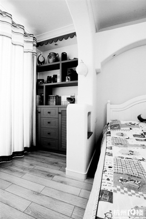 因为空间小,所以收纳也做得比较多。在卧室门上的空间,做了吊柜;玄关柜听取了设计师的意见,做得比较深,下面放洗衣机,上面是储存空间,保证了室内空间的整洁。