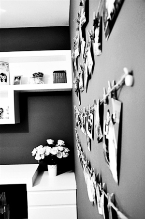 客房兼书房的蓝色墙面比较空,准备作照片墙。但照片很多,如果用相框,感觉太普通,满墙摆放也很杂乱。于是用几条麻绳固定在墙上,上面用彩色的小夹子,将照片一张张很随意地夹在上面。这样装饰后的照片墙既随意又很个性,同时还不伤墙面。
