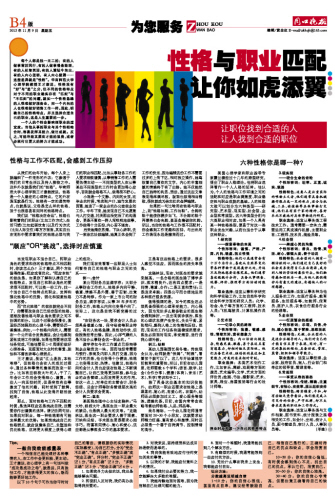 当发现职业不适合自己,即职业角色的要求和你的性格特点不相匹配时,你该怎么办?王才康说,两个方法值得借鉴:顺应或者优化。“顺应本性”的做法是,如果你了解和认清自己的性格特点,发现自己和职业角色的要求很不匹配时,可以换一份工作,找一个适合自己个性特点的职业,发挥和强化性格中的优势,弱化和规避性格中的劣势。