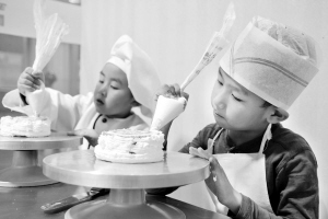 11月10日,在兰州市摩尔小镇儿童职业体验馆内,“小面点师”们正在全神贯注地做蛋糕。