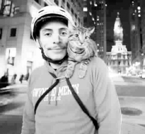 这是一只棕灰色虎斑猫,雌性,现在7个多月大,与主人鲁迪·萨尔迪亚住在费城。萨尔迪亚现年25岁,是邮递员,每天骑着自行车送邮件。
