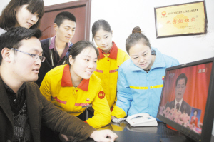 11月8日,备受瞩目的中国共产党第十八次全国代表大会在北京隆重召开。连日来,周口社会各界通过电视、网络、报纸、远程教育等一直热切关注着十八大。图为一家公司的员工聚在一起,通过网络收看十八大报道。