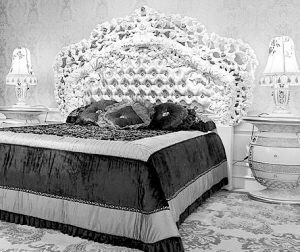 华莎驰这一张大床背后的雕花极尽繁复和华美,配合珍珠色的软靠背,媚态尽显(图4)。
