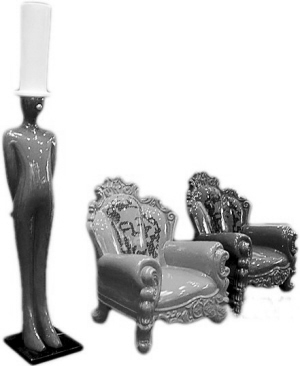 粉色和宝石蓝的两张座椅相依而立,靠背上印上了带点抽象的梦露式经典笑容,旁边峭立的人形落地灯,更是衬托出家具本身的柔美(图2)。