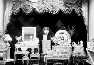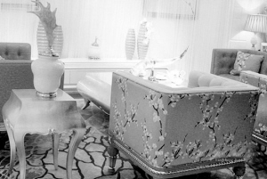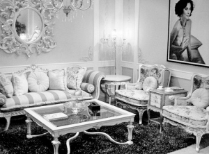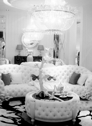 虽然由皮质、布艺、钉珠、雕花等不同的材料组成,但“80-90”这一套客厅家具的颜色几乎都是纯白的色调,而顶上的吊灯同样是晶莹的白水晶,还有雪白的羽毛装饰环绕四周(图7)。