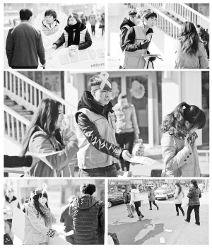 志愿者在街头宣传艾滋病知识遇到许多市民的冷遇(拼版照片,11月14日摄)。