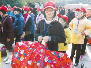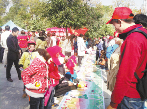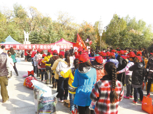 本报讯 “我也想参加小记者,把我的衣服捐给灾区的小朋友。”活动现场有位小姑娘哭着跟妈妈说。11月17 日上午,周口晚报小记者们聚集在周口人民公园,“让爱前行,大型爱心捐赠公益活动”正在进行中。小记者们排着整齐的队伍,头戴小红帽,脸上都贴有红色的爱心,他们手提衣服、书籍排队捐献。