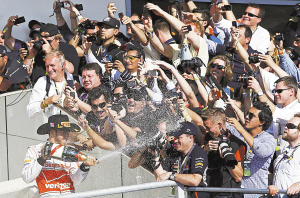 当地时间11月18日,迈凯轮车队英国车手汉密尔顿(左下)在颁奖仪式上庆祝胜利。当日,在F1美国站正赛中,汉密尔顿以1小时35分55秒269的成绩夺冠。