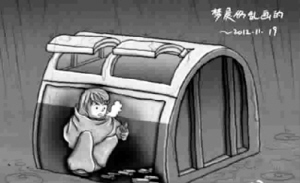 网友根据毕节市5少年垃圾箱里取暖中毒死亡事件制作的漫画“玩火机的小男孩”