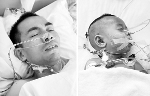 11月21日,父亲万金强在普通病房接受术后治疗(左图),儿子凡凡(化名)在重症加护病房接受术后观察(右图)。
