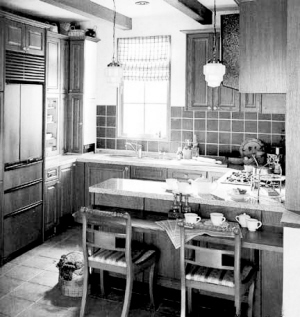 可以利用墙面、吊柜的下方,为厨房增加格外的收纳空间。台面上方最便于拿取物品的位置,非常适合抽屉的设置,玻璃门板上有自然的装饰,金属旋钮状拉手方便拉取。