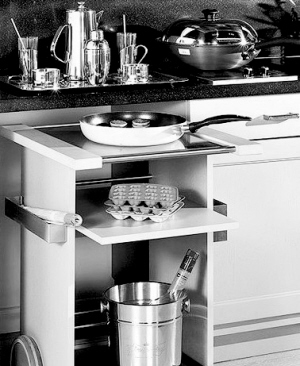 灶台柜或水槽柜下方,可设置抽屉柜去收容大型以及不常用的锅具;常用的杯盘碗则要放置于上柜,不用翻找就能一目了然。