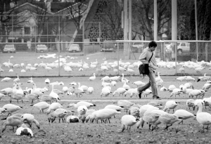 11月28日,在加拿大温哥华地区里士满市,一名男子在一个有大批雪雁栖息的公园里散步。