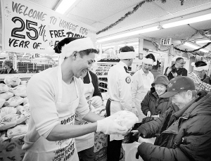 12月2日,在加拿大多伦多,人们领取免费火鸡。