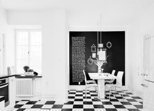 马赛克黑白色瓷砖地板带来强烈的视觉冲击。白色完美的中和了开放式餐厅大面积黑色背景墙,在白色的衬托下,显得更加气质不凡。明黄的冰箱为空间增添一抹亮色,整个厨房活泼了不少。