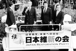 12月4日,在日本大阪的梅田街头,“日本维新会”党首石原慎太郎(左二)发表演讲,为该党在众议院选举中造势。