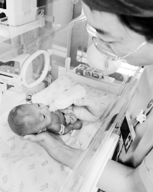 12月4日,秦皇岛市妇幼保健院新生儿科的医生在给“拇指姑娘”小花喂奶。