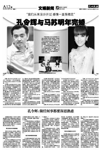 早前有爆出马苏与吴奇隆合作《新白发魔女传》闹出绯闻后,有媒体爆料马苏与孔令辉十年情终结,且双方均未正面回应过此事,近日孔令辉接受媒体专访,当谈到他与马苏的感情问题时。他表示“我们从来没分开过,十年爱情保鲜的秘籍在于‘信任’。因为女友事业正在往高处走,自己作为教练也脱不开身,需要一个合适的时间,去把证领了。”他透露将会在明年结婚,至于是否邀请记者,一切都由马苏决定。
