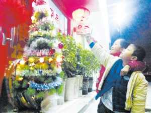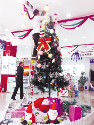 图一:市区中州大道一手机卖场在布置圣诞树。