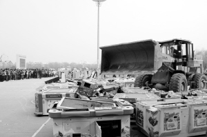 12月12日下午,在沈丘县行政新区广场,该县举行了“铲赌患、正风气”集中销毁赌博游戏机仪式,警方现场对收缴来的100余台赌博机进行了集中销毁。