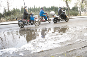 昨天上午,周口市区滨河中路,行人绕过结冰的路面通行。据了解,这段道路凹凸不平,路坑里存的积水已经结冰。附近居民称,他们快要无法通行了,目前出门几乎成了大家的一块心病。晚报记者 朱海龙 摄