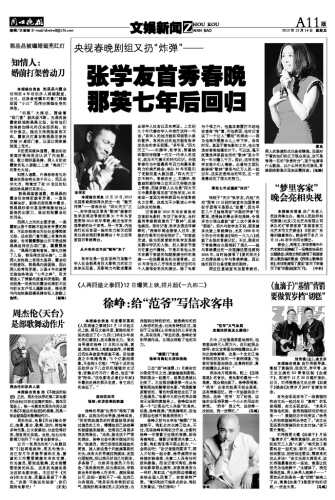本报综合消息12月12日,2013央视春晚剧组再次扔出一枚“轰天炸弹”——香港乐坛“四大天王”之一、在华语地区享有“歌神”盛誉的张学友将在春晚的第31个年头首度亮相2013蛇年春晚,献出他在央视春晚的处子首秀。另一方面,内地流行乐坛首屈一指的实力派天后那英也将在阔别春晚舞台7年之后再度回归春晚舞台。