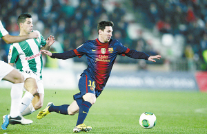 本报综合消息 北京时间12月13日凌晨,2012/13赛季西班牙国王杯1/8决赛首回合一场焦点战在阿尔坎杰尔球场展开争夺,巴塞罗那客场2∶0取胜科尔多瓦,梅西打入2球再次扩大年度进球纪录。