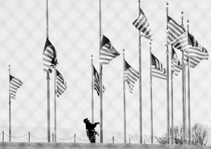 12月14日,在美国首都华盛顿国家纪念公园的华盛顿纪念碑下,一名工作人员降半旗悼念枪击案遇难者。