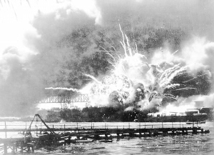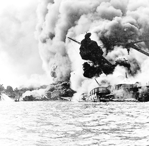 1941年12月7日,日本军队出动6艘航母和350余架飞机偷袭美国在太平洋夏威夷群岛上的重要海军基地珍珠港,在两个小时内炸沉炸伤美军舰艇40余艘,炸毁飞机200多架,导致2402名美军阵亡和1282人受伤。美军主力战舰“亚利桑那”号被炸弹击中沉没,舰上1177名将士全部殉难。时任美国总统罗斯福第二天宣布这一天为国耻日,并对日宣战,太平洋战争爆发。