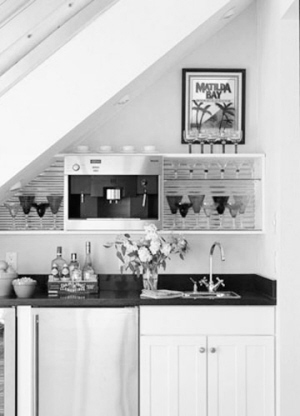 因为其高度有限,楼梯下方的空间可能并不好利用。不过一个餐厨操作台正好乐意弥补这样的缺陷。利用开放型的搁架来占据楼梯下方空间的宽度,就完全不会再有对不规则空间的种种顾虑,一块让人头疼的地方完美得被餐厨操作台完全填平。