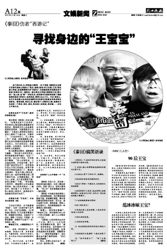 王宝宝不易找,总不能复制“囧途”,也来一次旅行碰个运气吧?不过,王宝可以复制。《人再囧途之泰囧》只不过是用喜剧外壳,把傻根与时俱进,包装成了王宝宝。傻根(王宝宝)不难做,如果你愿意,你随时可以放下一切,变成他(她)。