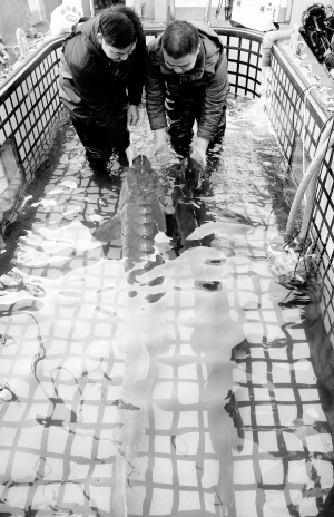 12月18日,工作人员准备将中华鲟从特制的运输车上卸载下来。
