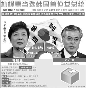 韩国新国家党总统候选人朴槿惠,在12月20日凌晨举行的韩国第18届总统选举中以微弱优势战胜主要竞选对手文在寅,成为韩国历史上首位女总统。