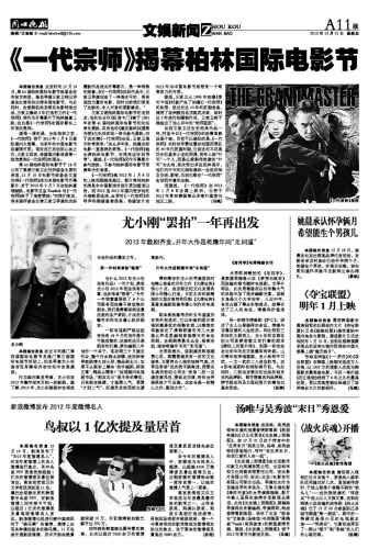 另据悉,《一代宗师》在2013年1月8日全国上映后,也将于2013年春在德国等众多海外国家与地区上映。(马彧)