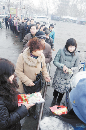“快来快来,买《周口晚报》免费送饺子啦……”排队的人中有义务向路人做宣传的,有给亲戚朋友打电话的。队伍越排越长,很多路过的市民也来凑热闹。有白发苍苍的老人、抱着孩子的妇女、摩登时尚的美眉,也有身着黄马甲的环卫工人、衣衫单薄朴素的农民工,大家都主动交上1元钱,高高兴兴地买上一份报纸,再领走一袋饺子。寒冷的天气抵挡不住市民们的热情,热闹的现场让每个人的心里都暖融融的。
