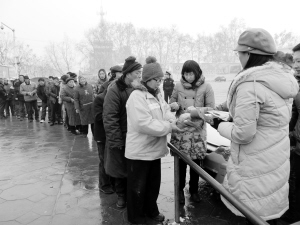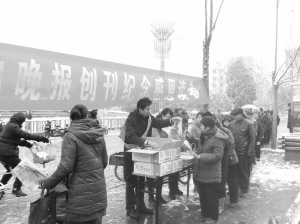“为了不耽误您上班,请火车站的工作人员到这边排队。只要您准备好1元零钱,很快就可以领到1份晚报和1斤饺子。”为了不耽误他们的上班时间,晚报工作人员为他们开辟了一条“绿色通道”。