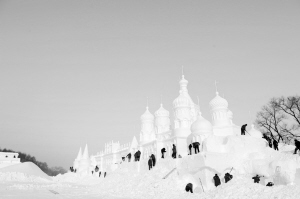 12月24日,雪雕工人在对雪雕作品进行收尾工作。