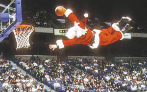 随着圣诞节到来,世界各地的圣诞老人也运动了起来,灌篮冲浪无所不能。图为圣诞老人表演花式灌篮。