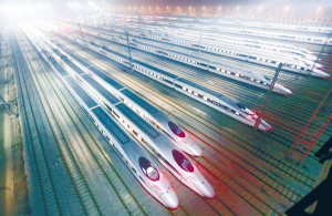 12月25日凌晨,众多京广高铁列车停靠在武汉动车基地,蓄势待发。京广高铁将于12月26日全线贯通,北京至广州的最快运营时间从现在的20多个小时缩短到8小时左右。京广高铁北起北京,经石家庄、郑州、武汉、长沙,南至广州,线路全长2298公里,是世界上运营线路最长的高铁,全线设计时速350公里,初期开通运营时速300公里。新华社发