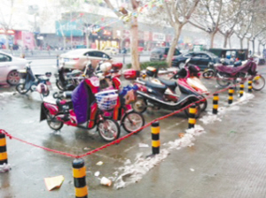 12月28日16时20分许,记者在周口荷花市场北门对面的金帝服饰鞋业广场门前看到,一根根高约50厘米的小圆柱子牢牢地在人行道上“扎了根”,柱体上黄色与黑色相间,十分醒目(如图)。记者粗略数了一下,柱子有30来根,每根柱子之间相隔约1米,且每根柱的顶端都有一个孔,有人用长长的细绳将柱子穿了起来,围成两个小型露天停车场,占去人行道宽度的一半左右,专供自行车、电动车和摩托车停放。记者看到,这里来往的行人很多。一些路人抱怨,人行道本来就窄,不该再设置这样的柱子,让他们通行很不方便,而且一不留神,这柱子就很容易变成“绊脚石”。记者向停车场内一名负责看管车辆的老人打听情况,他说是受雇于这家服饰鞋业广场的,负责免费看管消费者的车辆,并称自己刚来一个星期,不清楚是谁设置的柱子,也不清楚是何时设置的。